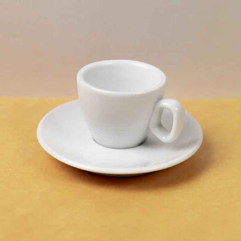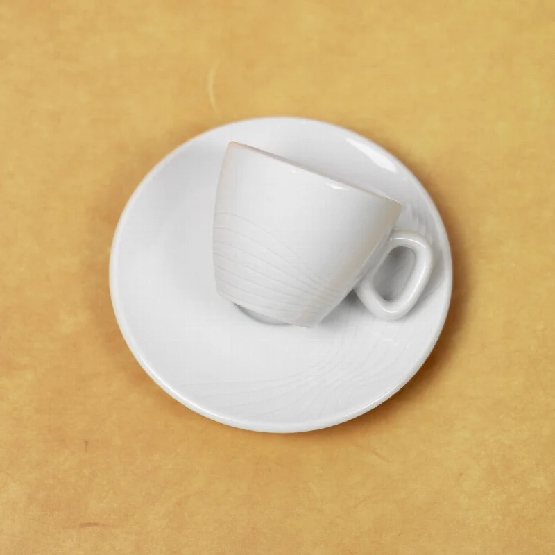 Отличительной чертой дизайна стали волнистые гравировки, нанесенные как на чашку, так и на блюдце. Объем чашки составляет 70 мл, что символично отсылает к юбилейной дате.