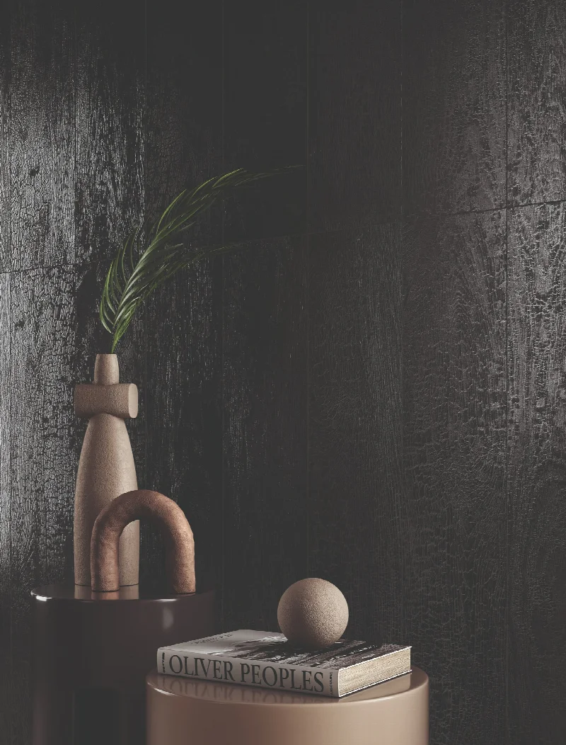 Коллекция предлагает два варианта декора. Первый воспроизводит эффект полностью обугленной, матово-черной поверхности. Второй представляет собой темно-коричневый фон, пронизанный контрастными черными прожилками, что создает иллюзию состаренной, благородной древесины.