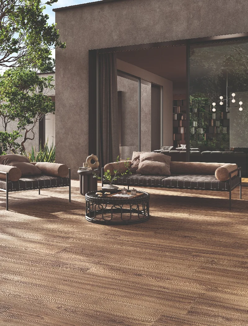 Это решение привносит в интерьер тепло, природную фактурность и сдержанную драматичность. Коллекция подходит как для внутренней, так и для внешней отделки, предлагая долговечную альтернативу дереву с уникальным визуальным характером и связью с многовековой традицией мастерства.
