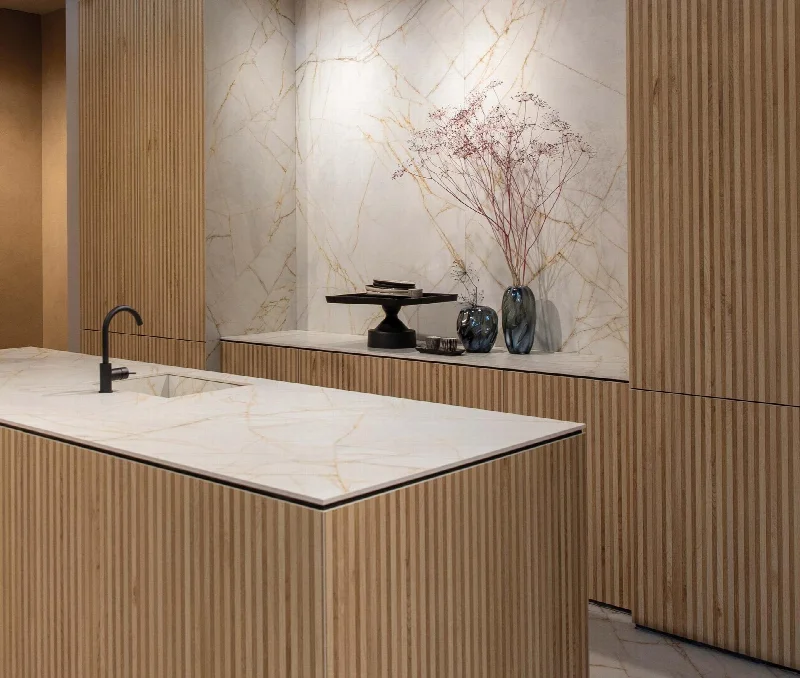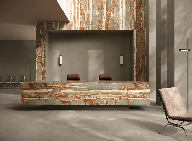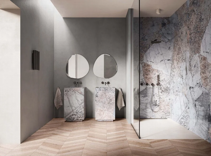 В основе линейки — тщательно подобранные разновидности редкого мрамора, дополненные яркими ониксами и кварцитами, которые стимулируют творческий подход и поощряют смелые сочетания стилей и материалов.