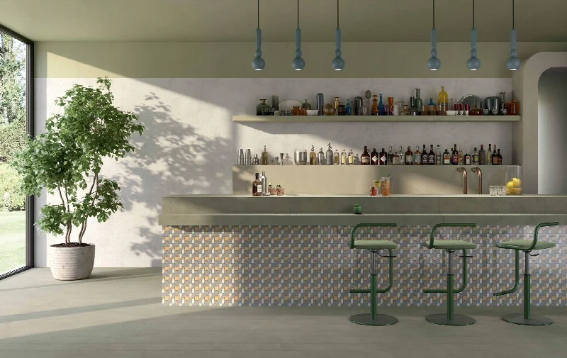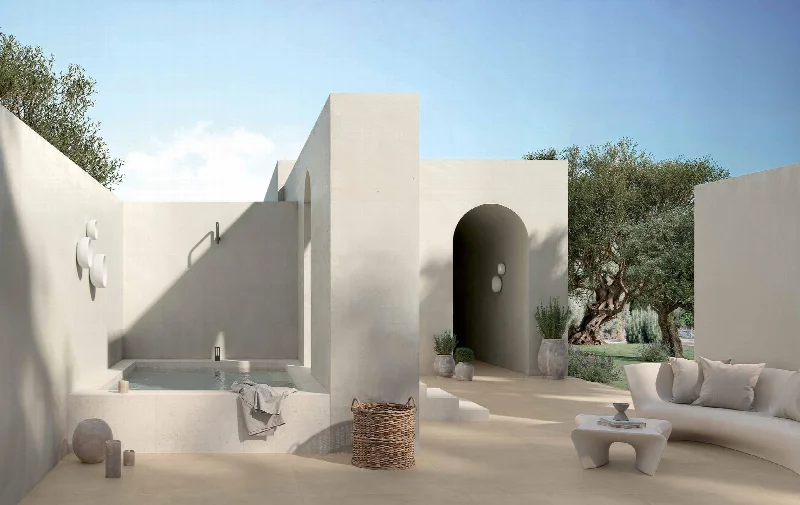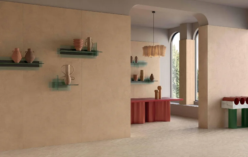 Коллекция с эффектом штукатурки предлагается в широком диапазоне форматов — от крупноформатных плит 120×280 см до удлиненных планок. Это позволяет создавать разнообразные схемы укладки с выразительными декоративными решениями.