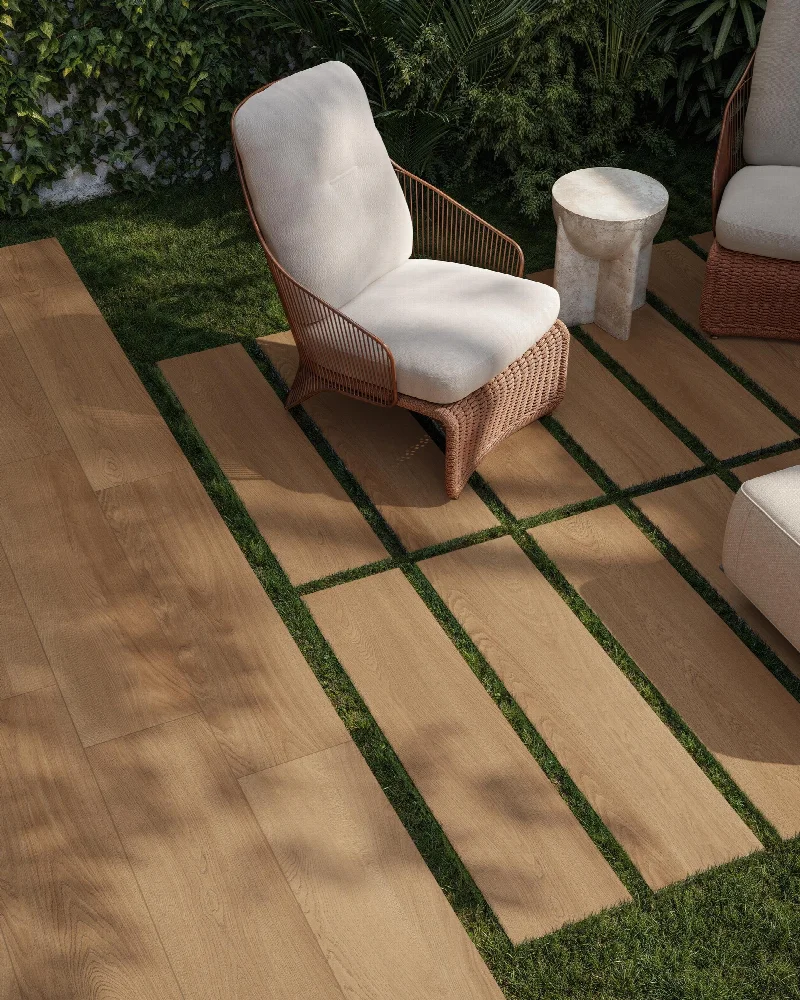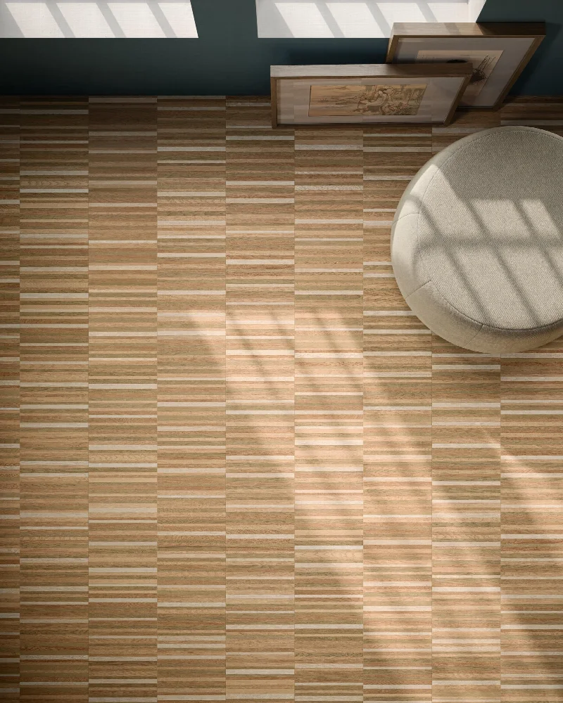 Поверхность обогащает интерьер, не перегружая его визуально. Текстура и цветовая гамма передают тепло и естественность натурального дерева, сохраняя при этом практичность и долговечность керамогранита.