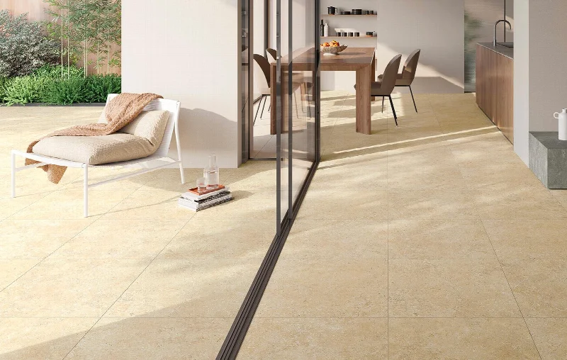 Поверхность сохраняет визуальную теплоту и текстуру травертина, но при этом отвечает высоким требованиям к практичности и долговечности керамогранита. Решение демонстрирует баланс между природным обаянием и технологичностью.