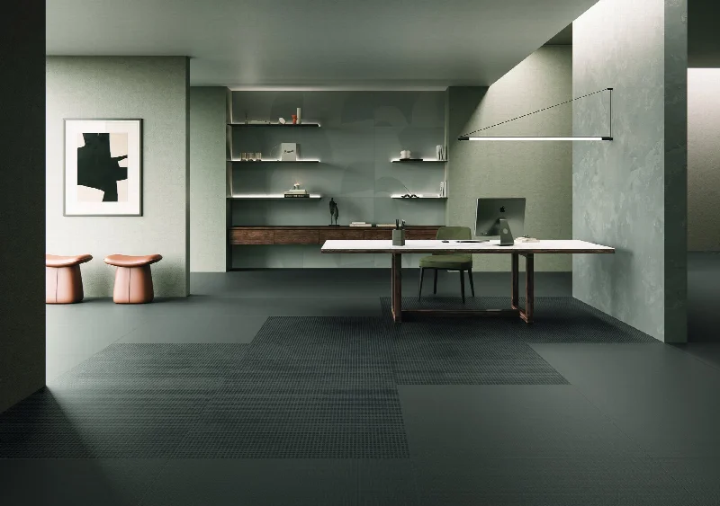 Поверхность сочетает тактильную глубину и контрастную выразительность. Игра света и тени на рельефе подчеркивает структуру материала, делая его активным участником формирования пространства. Черные эффекты добавляют драматизма и графической четкости, позволяя использовать коллекцию как для акцентных вставок, так и для целостных плоскостей.