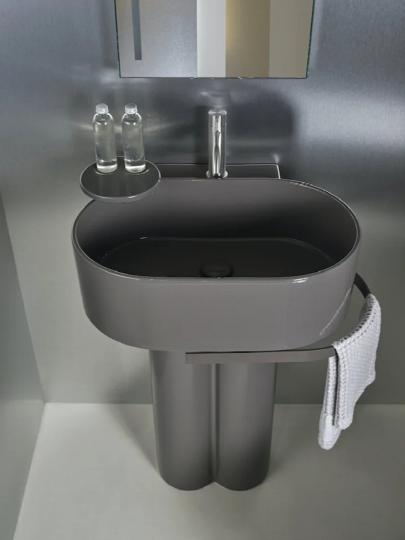 Отличительным элементом коллекции стали круглые и полукруглые полки, расположенные с одной стороны умывальника. Выполненные из керамики или дерева ироко, они в сочетании с изогнутым полотенцесушителем придают изделию полную эстетическую и функциональную автономность. Эта деталь превращает утилитарный объект в самостоятельную архитектурную композицию.