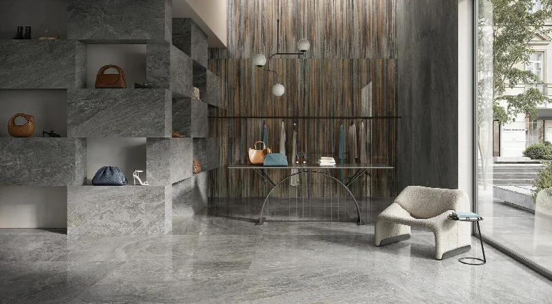 Палитра коллекции строится на геологической памяти месторождений. Три камня, каждый со своим характером и визуальным языком, переосмыслены через современные технологии керамического производства. Материал сохраняет аутентичность природных прообразов, но адаптирует их к требованиям актуальной архитектуры.