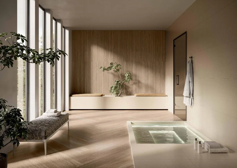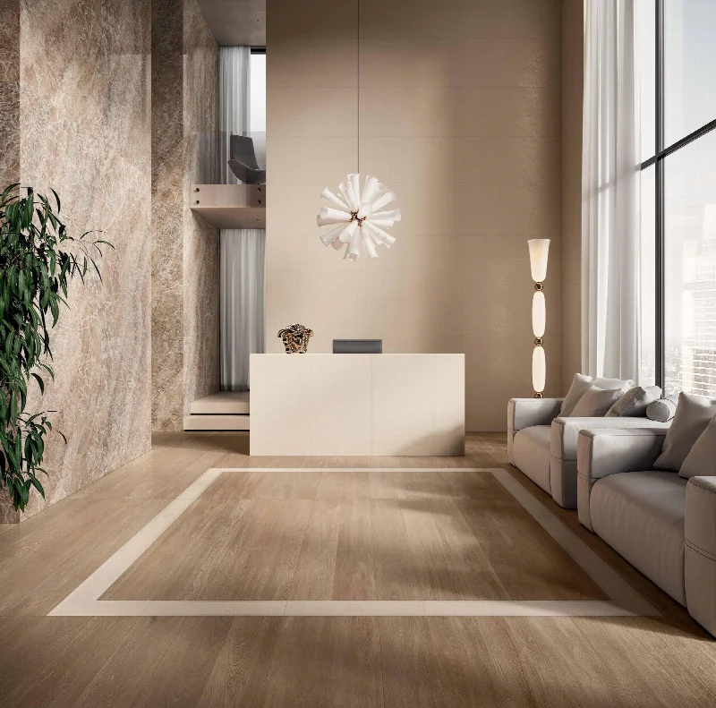 Компания Versace Ceramics представила новую коллекцию керамогранита Leatherwood, в которой природная красота дуба встречается с элегантностью тонкой кожи. Oak — натуральное дерево, известное своими насыщенными тонами, меняющимися со временем, сочетается с роскошным обликом дорогой кожи, традиционно используемой для аксессуаров и мебели. Благодаря передовым керамическим технологиям это соединение обретает новое звучание в архитектурных поверхностях.