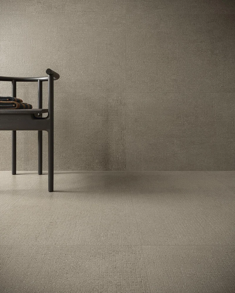 Текстура объединяет холодную графику бетона и теплую, рукотворную выразительность мозаичных фрагментов. Игра контрастов — между гладкими плоскостями и дробным узором, между сдержанностью и декоративностью — создает визуальную глубину и тактильную сложность. Материал приглашает к исследованию и открытию новых граней.