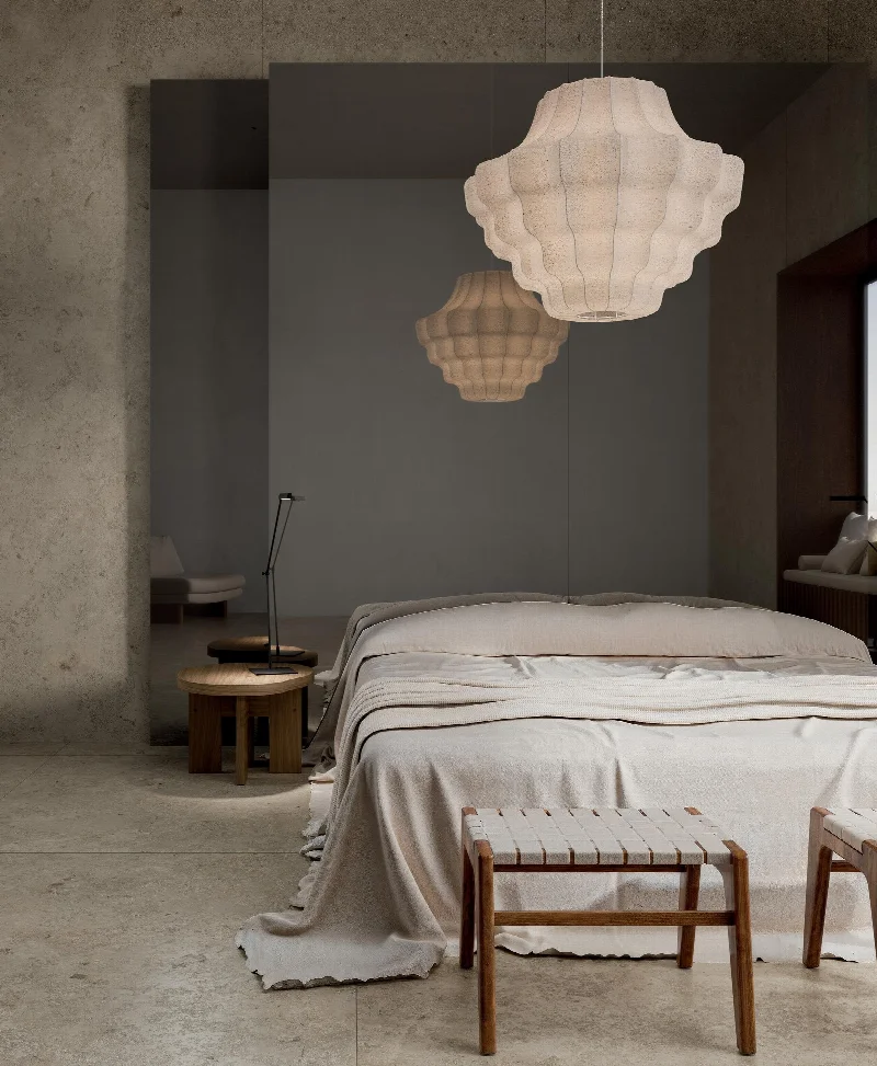 Коллекция отличается игрой света, постоянно меняющейся в зависимости от угла зрения и освещения. Мягкие переливы и благородные отражения создают иллюзию глубины и движения, делая каждую поверхность уникальной. Такой подход привносит в интерьер ноту современной элегантности и оптической сложности.