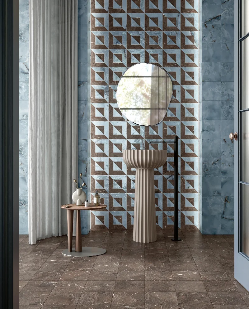 Поверхности сочетают богатство мраморных текстур и глубину многослойных глазурей. Каждый узор предлагает уникальную интерпретацию классических мотивов, сохраняя при этом современное звучание. Игра света на фактурной поверхности добавляет визуальную сложность и тактильную выразительность, характерную для премиальных материалов.