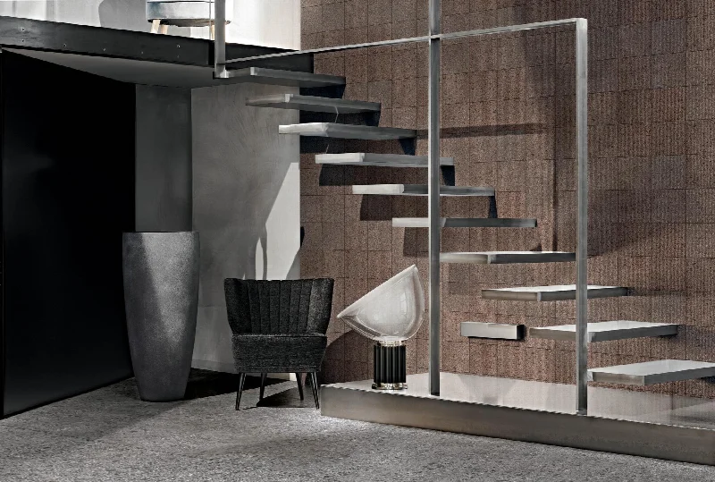 Поверхность передает характер вулканической породы с ее шероховатостью и глубиной. Материал сохраняет природную аутентичность и тактильную выразительность, адаптированную к требованиям современного дизайна. Игра света на неровной фактуре создает динамичный, живой облик.