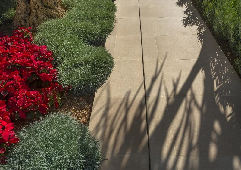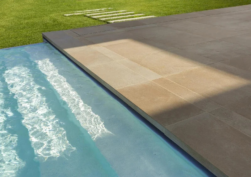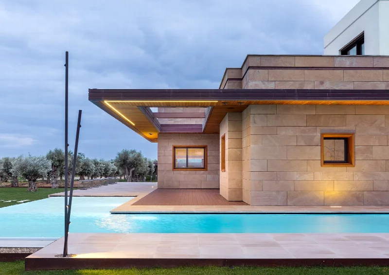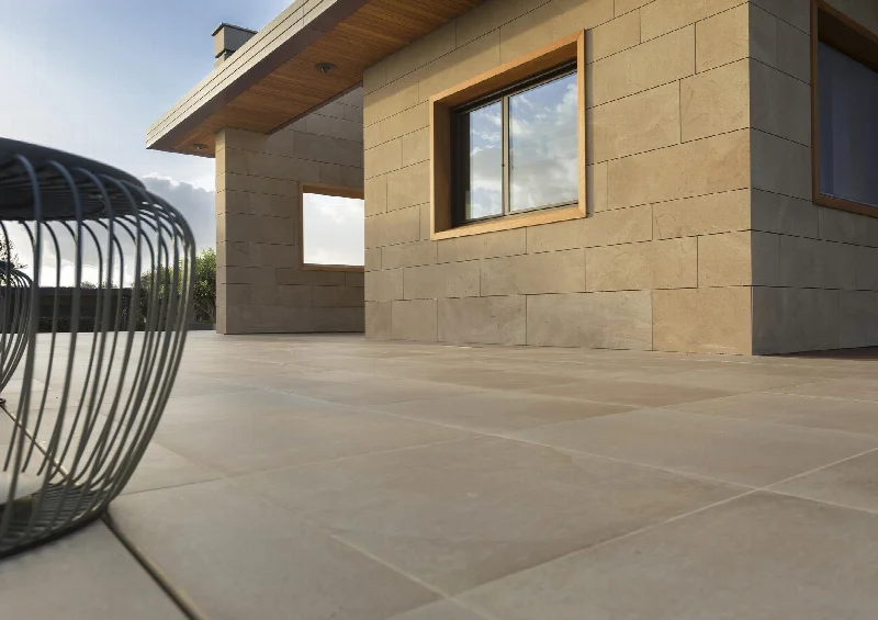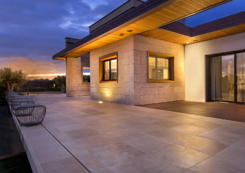 На уровне земли появилась еще одна важная деталь — приподнятая платформа, парящая над ландшафтом. Для ее облицовки был выбран керамогранит Pietre Native Baugé Beige от Casalgrande Padana. Плиты размером 60×60 см с характерной текстурой повторили не только эстетику натурального камня, но и его главное для этого места качество — исключительную стойкость к соли. Этот же материал, уложенный насухо на гравийное основание с использованием вентилируемых опор, был применен для террас и крыши, создав материальное единство всех горизонтальных плоскостей.