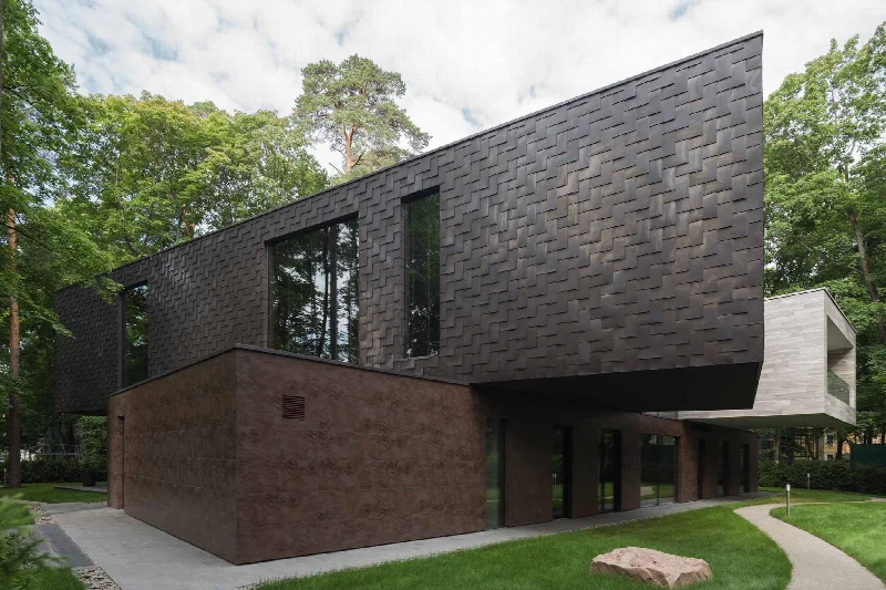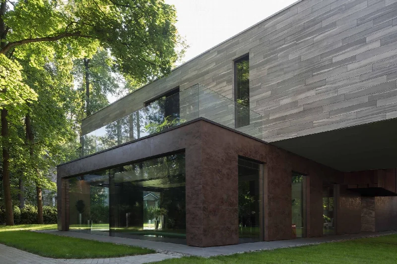 Участок продиктовал условия. Лесной ландшафт с его плотной растительностью требовал деликатного вторжения. Архитектурное решение родилось из диалога с природой: три объема, словно вырастающие друг из друга. Мощное цокольное основание и два смещенных параллелепипеда поверх него — композиция, которая кажется одновременно устойчивой и динамичной. Нижний уровень, облицованный крупноформатными керамическими плитами с эффектом окисленного металла, уходит корнями в землю. Верхние объемы легче: один — в бело-серой мраморной графике, другой — в металлической чешуе, мерцающей на свету.