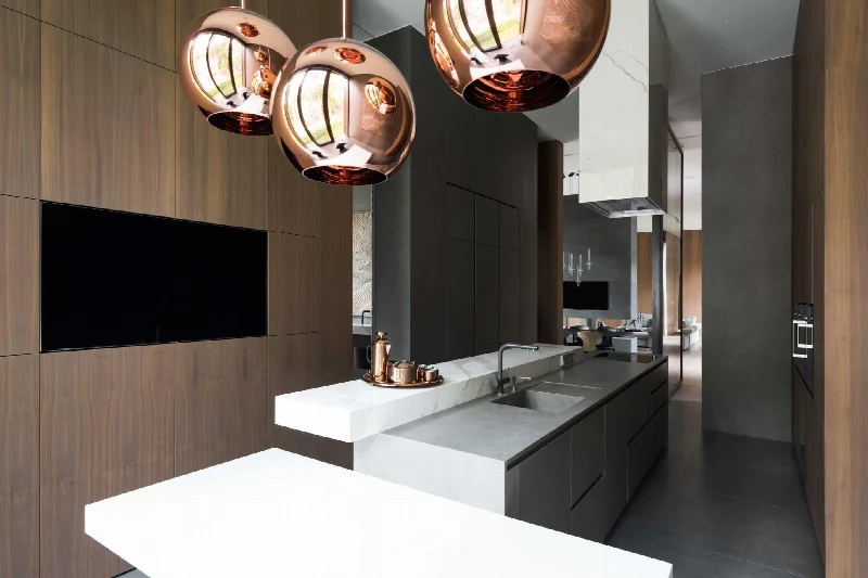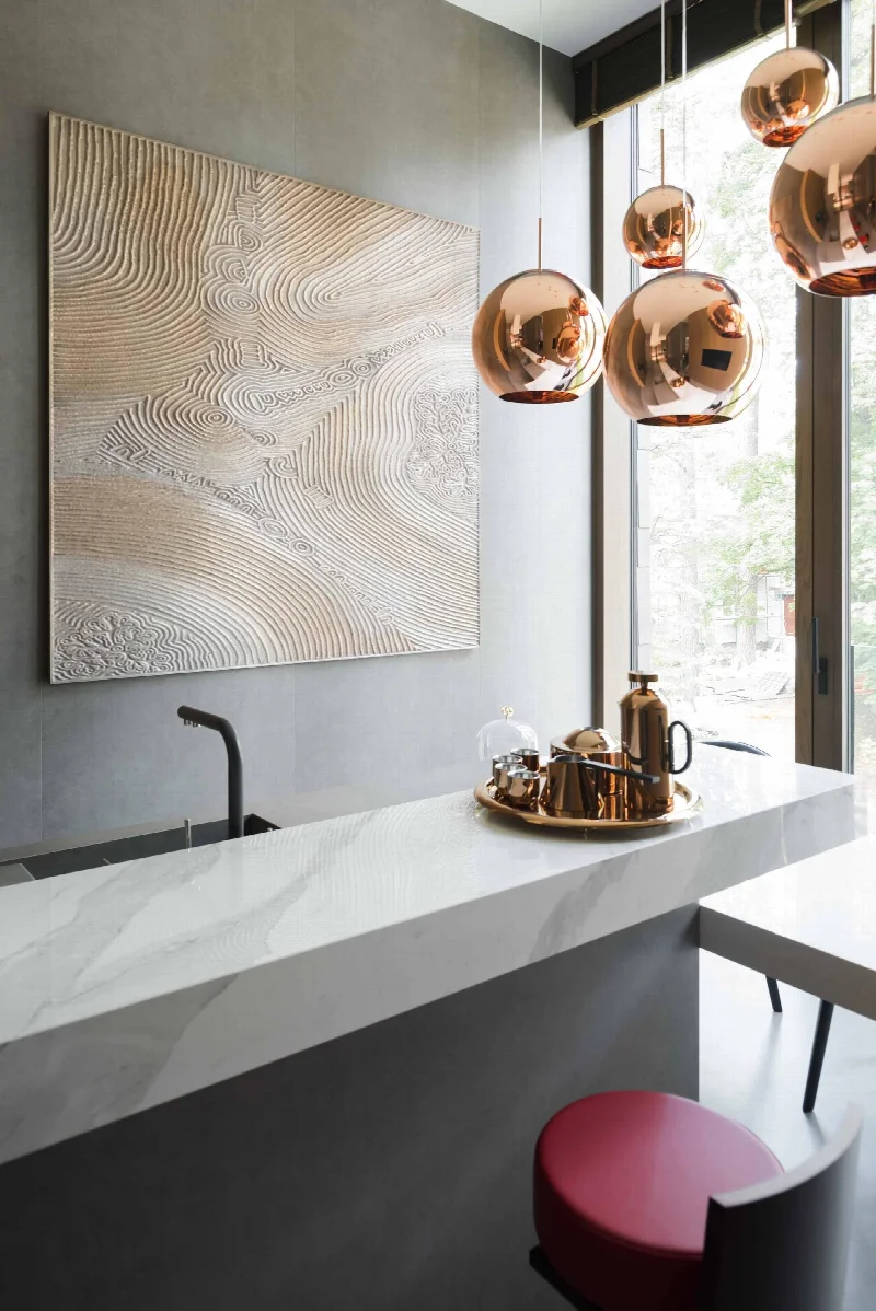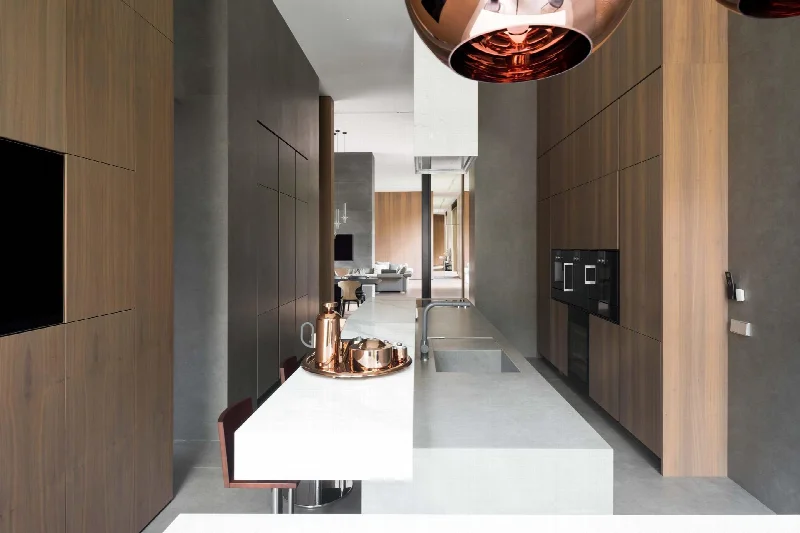 Кухонный остров покрыт фактурой Fokos — Rock. Тяжелый, почти скульптурный объем, на котором установлена встроенная раковина, работает как центр притяжения. А столешница из полированного Bianco Statuario Venato привносит единственную ноту осознанной роскоши. Но и она сдержанна, как свет, отражающийся от мраморных прожилок.