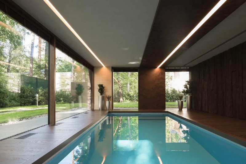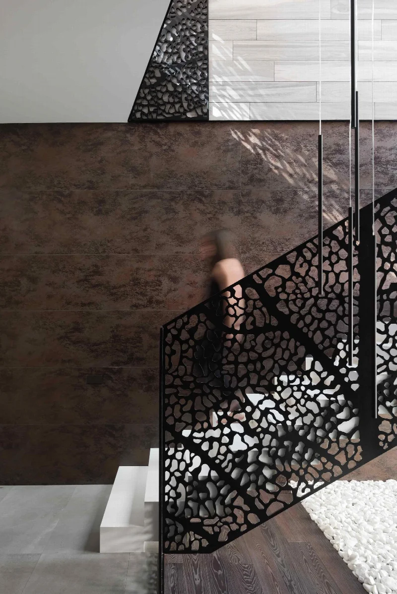 Граница между внешним и внутренним стерта намеренно. Та же оксидная поверхность, что встречает гостя у входа, сопровождает его вдоль лестницы и ведет к бассейну. В гостиной полы и стены облицованы плиткой с фактурой пиленого камня — Pietra di Savoia Grigia Bocciardata, той же, что использована в наружных воротах. Дом не переодевается внутри и снаружи в разные одежды. Он остается собой.
