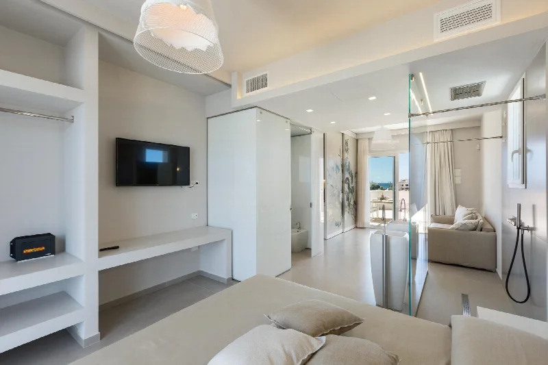 Архитектура Perla Saracena строится на контрасте, который оказывается глубже простой игры фактур. Первые этажи облицованы местным камнем ручной работы. Грубый, тактильный, почти первозданный, он отсылает к вековым традициям салентинского зодчества. К тем самым «пахарам», что столетиями защищали фермеров от зноя и ветра. На уровне цоколя камень встречается с высокотехнологичной штукатуркой. Она специально разработана для агрессивной морской среды: дышащая, натуральная, устойчивая к соли и влаге. Это диалог, в котором ни один из голосов не пытается перекричать другого.