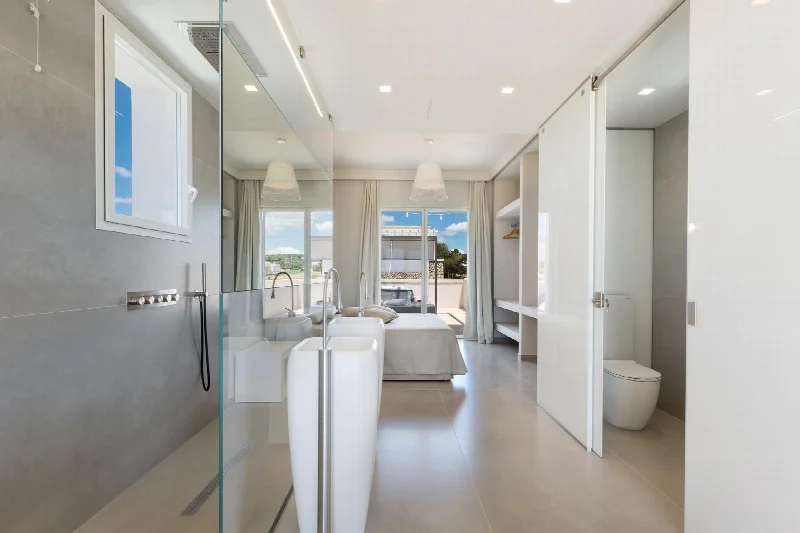 Планировка вилл подчинена идее безмятежного отдыха. На первых этажах классическая схема: гостиная с скрытой мини-кухней, спальня, ванная с эмоциональным душем. Пентхаусы предлагают иной сценарий. Это открытое пространство, где приватный спа-центр становится естественной частью жилой зоны. Хромотерапия, распыление, ионизированная вода для массажа заключены в глянцевый белоснежный кристаллический куб. Почти скульптурный объект мерцает на свету.