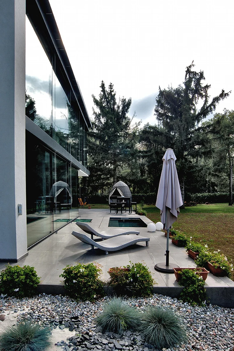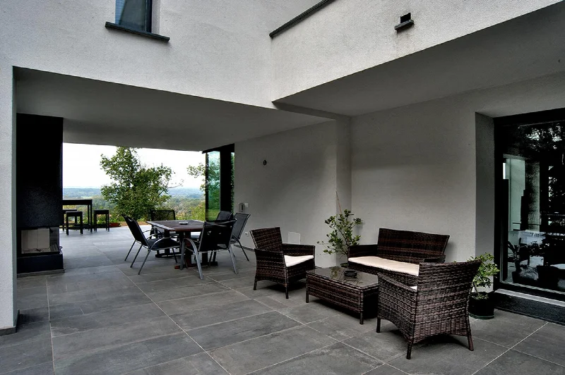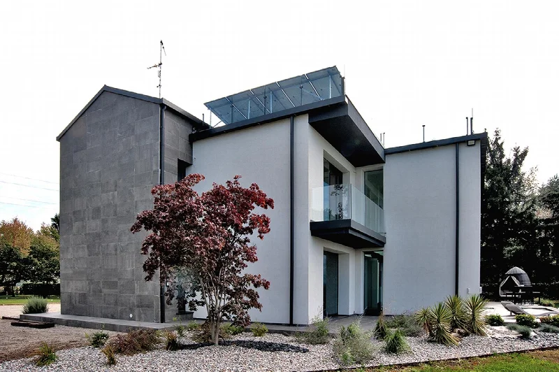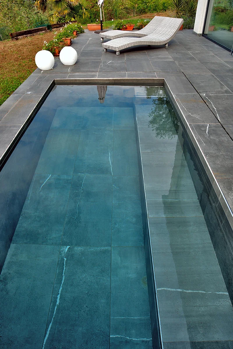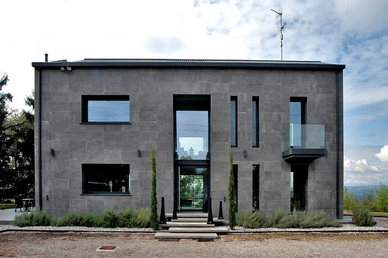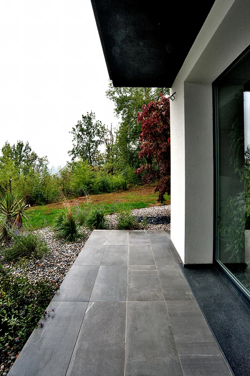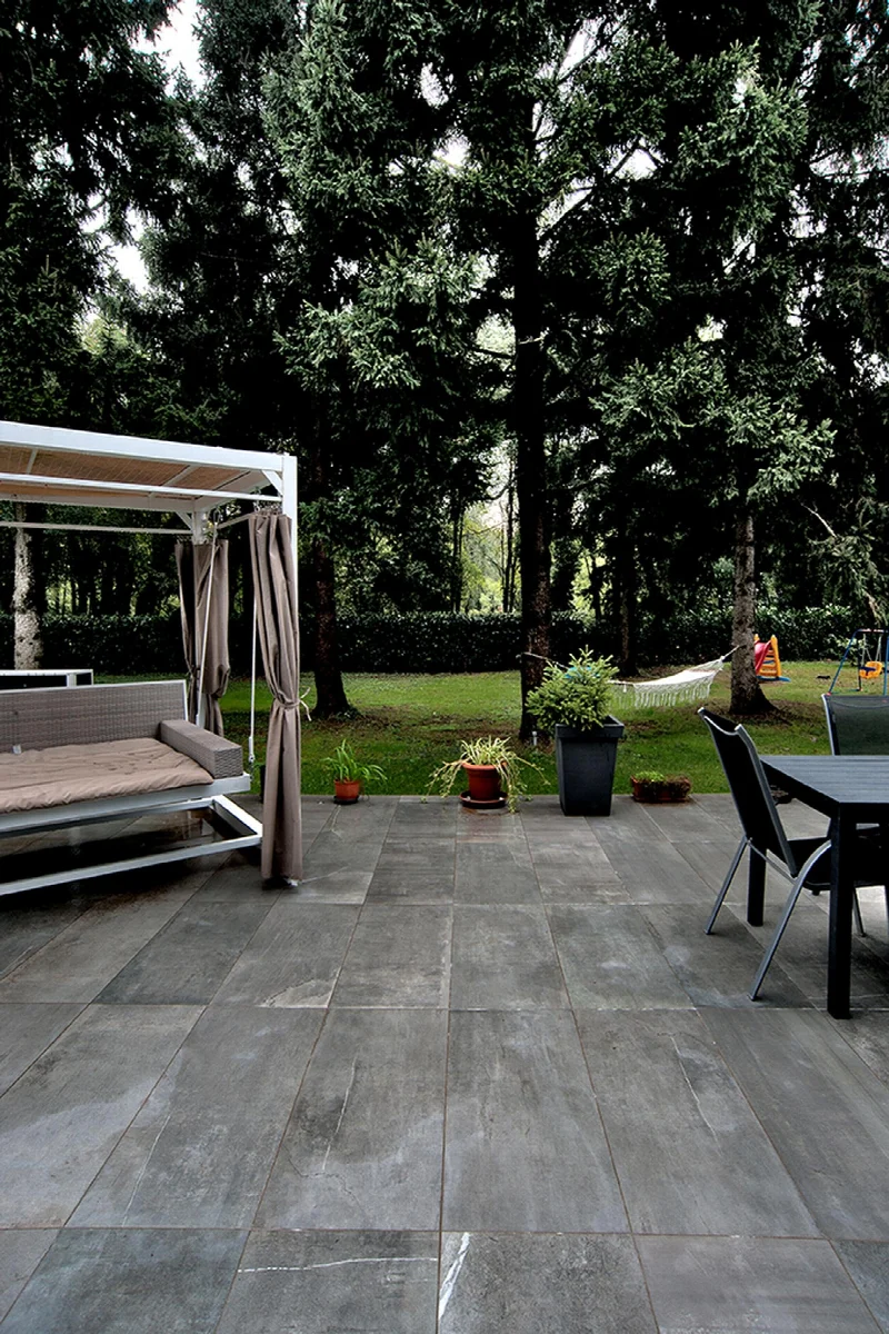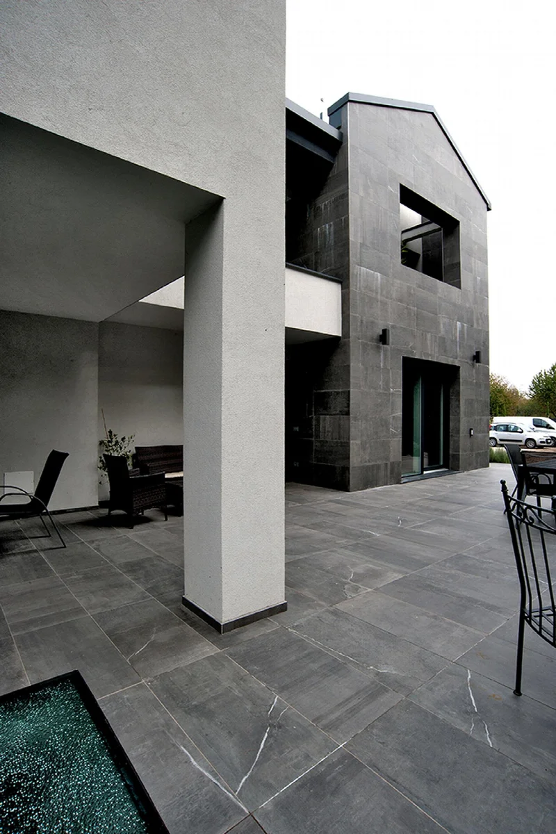 Для облицовки уличного фасада архитектор выбрал керамогранит серии Stoneone от Marca Corona в тёмном оттенке. Грубая, напоминающая каменоломню текстура создаёт ощущение цельности и монолитности. Формат 45×90 см позволил легко смонтировать плиты на вентилируемый фасад, что дополнительно повысило энергоэффективность здания. Этот же материал использован не только на стенах, но и в саду: дорожки, внутренний дворик, зона барбекю и даже чаша гидромассажной ванны отделаны той же керамикой. Так возникает визуальная и тактильная непрерывность между домом и участком.