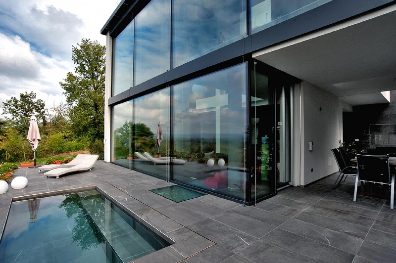 Ачини предлагает неожиданное решение: каждый фасад обретает собственный характер. Сторона, обращённая к улице, решена в тёмных, монолитных тонах, отсылающих к сдержанной архитектуре бывшей таможни. Здесь царит строгость и устойчивость. Напротив, фасад, выходящий в сад и открывающий вид на долину, почти целиком состоит из огромного 10-метрового окна. Стекло придаёт объёму лёгкость, а прозрачность стирает грань между интерьером и пейзажем.