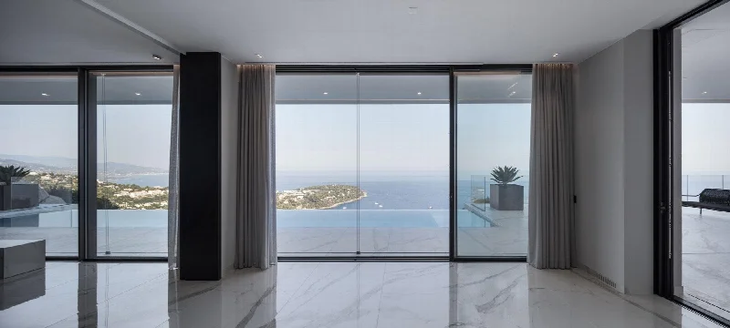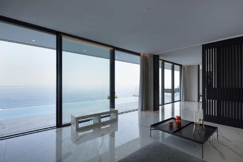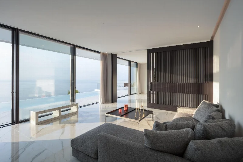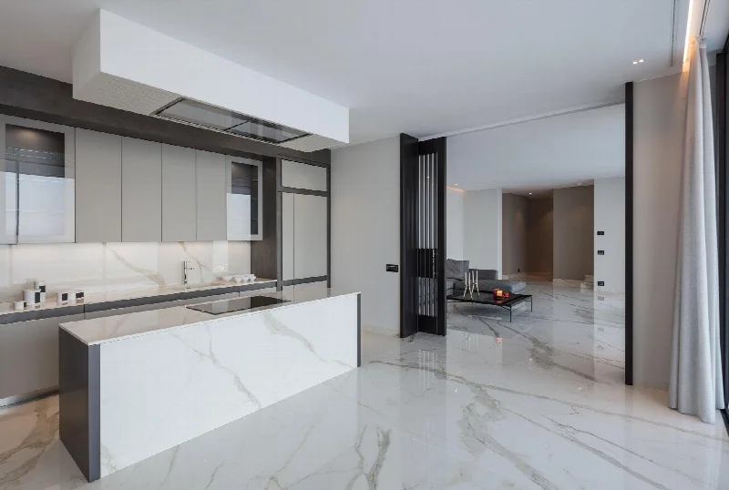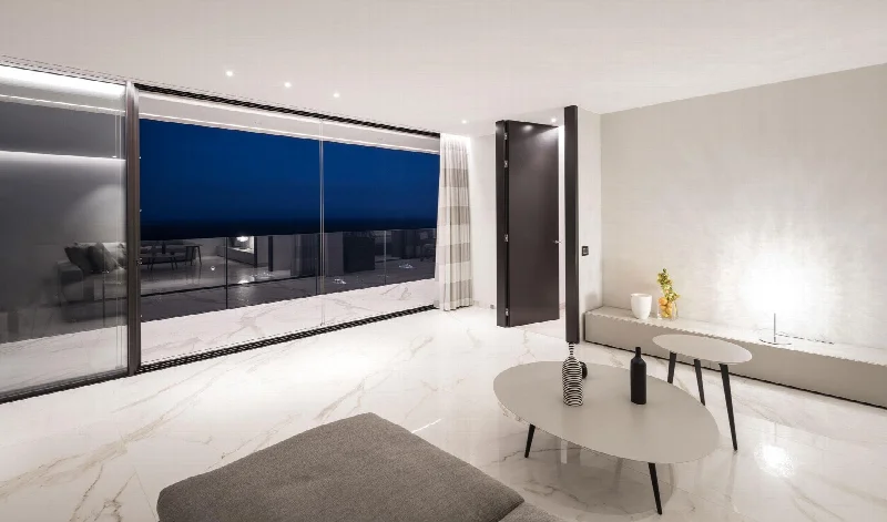 Материалы играют ключевую роль в созданной атмосфере. Выбор керамических изделий Laminam, компании, первой разработавшей крупноформатные панели малой толщины, стал важнейшим элементом подхода. «Материалы выбирались за их долговечность, но прежде всего за визуальную выразительность», — утверждают архитекторы. Использованные в вилле коллекции создают поразительную эстетику «total look», вдохновленную текстурой каррарского мрамора. Выбранные в крупном формате 1×3 метра, коллекции I Naturali – Calacatta Oro Venato, I Naturali – Calacatta Oro Venato Lucidato и Filo – Mercurio применены во всех ванных комнатах, кроме главной. Эти великолепные керамические панели, вдохновленные эстетикой натуральных материалов, значительно превосходят их по техническим характеристикам. Они не только придают элегантность всем поверхностям, но и создают захватывающее ощущение визуальной и пространственной непрерывности между декором и контекстом. Своеобразный «бесконечный ковер» рождает волнующую игру прозрачностей и отражений, сияющих на солнце днем и мерцающих звездами в ночной темноте.