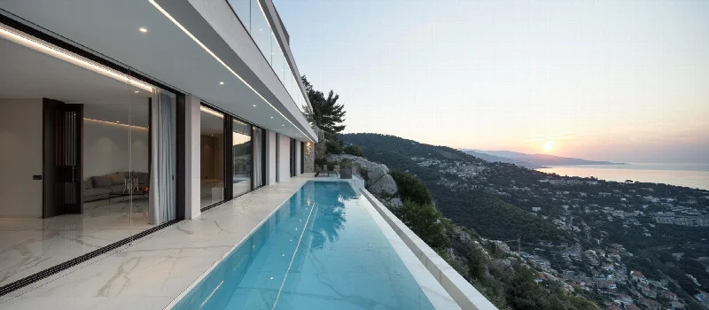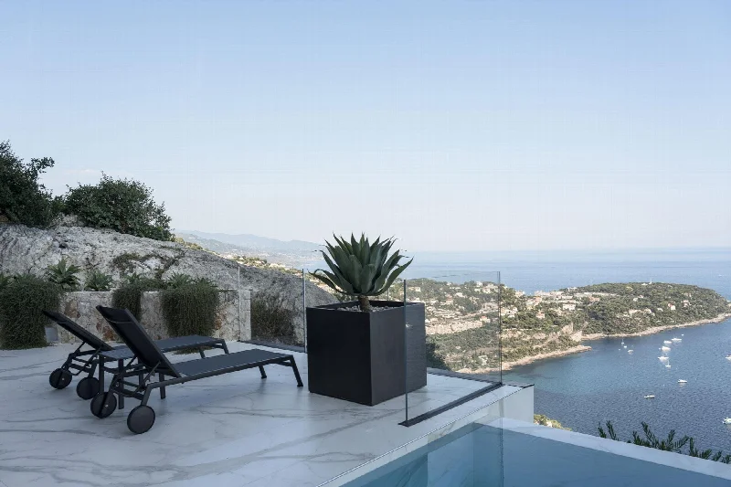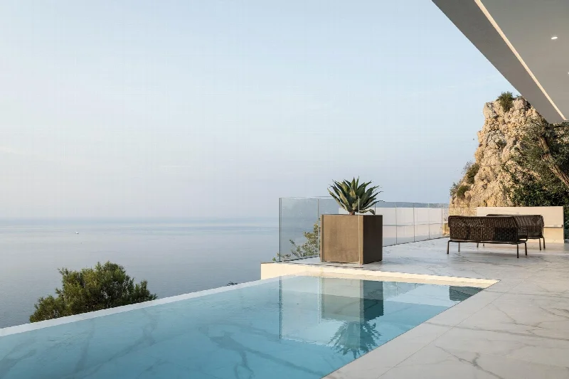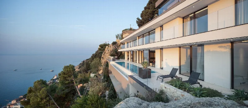 Муниципалитет Рокбрюн-Кап-Мартен на Лазурном Берегу — настоящая ода модернистской архитектуре. Здесь расположены многочисленные постройки великих зодчих XX века, среди которых вилла E-27 Эйлин Грей и Кабанон Ле Корбюзье. Не случайно, когда архитекторы Марко Кальви, Гаэтано Ческиа и Андреа Вигано получили заказ на проектирование виллы, вписанной в скалистый склон над морем, они обратились к наследию Ле Корбюзье. Слова мастера из книги «К архитектуре» 1923 года стали творческим манифестом: «Архитектор, организуя формы, создает порядок, который есть чистое творение его духа; формами и очертаниями он остро воздействует на наши чувства...»