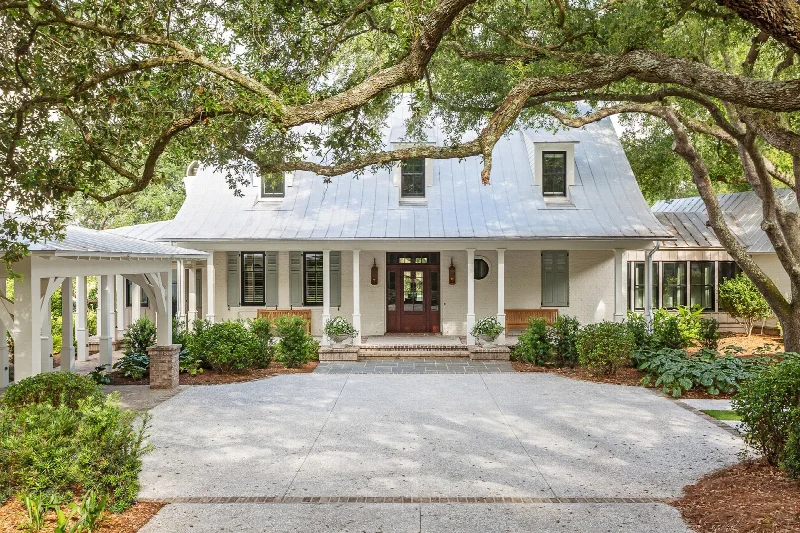 Дом на берегу Джеймс Айленд Крик полностью оправдывает определение «дом мечты». Чисто белое здание с характерной крышей-пагодой, нависающей над фасадом и образующей тенистую веранду, окружено ухоженным газоном. Старые дубы на участке частично скрывают вид на реку, создавая камерность и интригу.