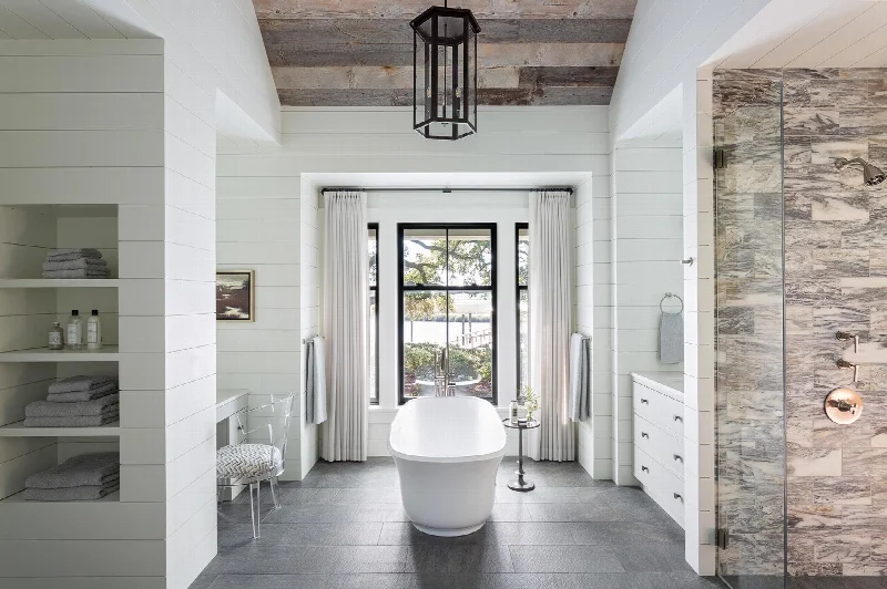 Яркий пример — просторная хозяйской ванная комната. Для покрытия пола здесь использована коллекция керамогранита Stoneline от Marca Corona. Натуральный вид поверхности, имитирующей камень, и выбор черного цвета создают предельно гармоничный эффект, не жертвуя практичностью и долговечностью керамики.