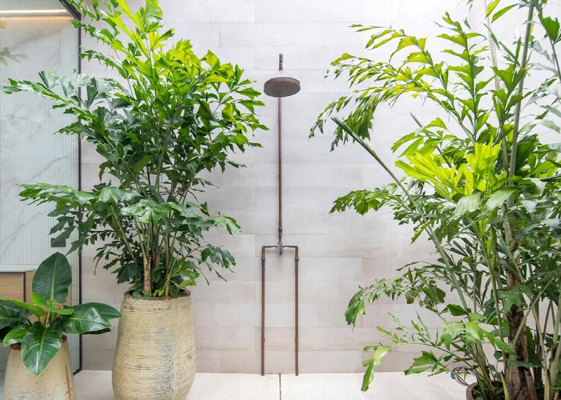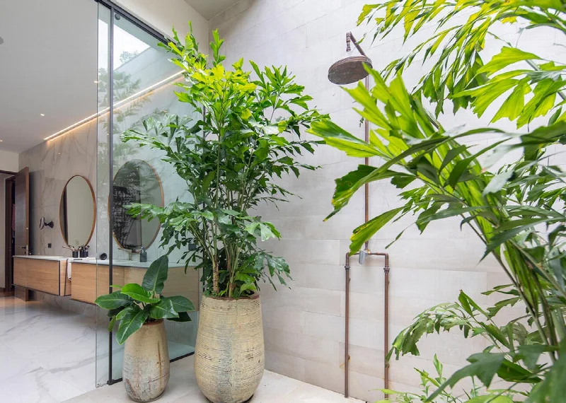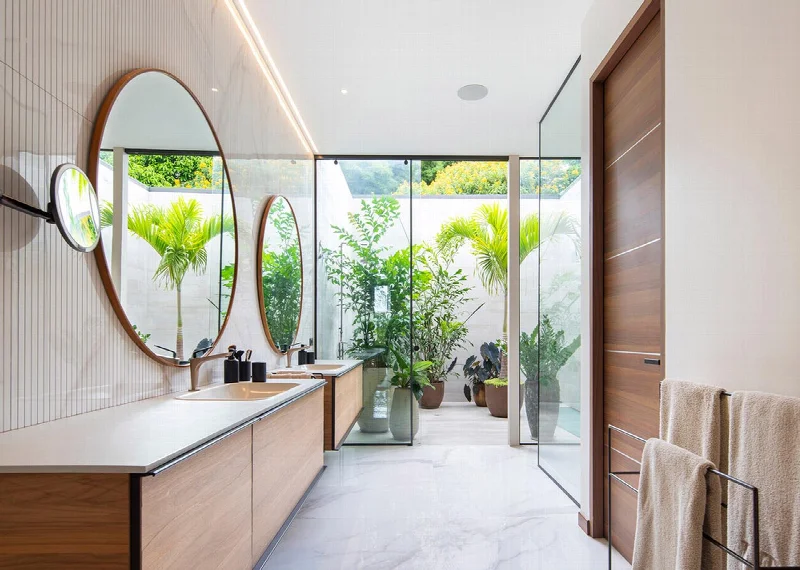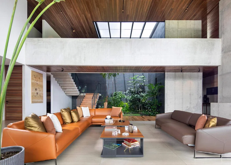 В эстетике пространства доминируют большие диваны землистых оттенков. Но главный акцент — имплювиум, внутренний дворик для сбора дождевой воды. С двух сторон он облицован серыми плитами из коллекции Metaline от Italgraniti, а в его центре растет крупная пальма, создавая вечнозеленый зимний сад. «Здесь природа обретает форму поразительного скульптурного высказывания», — замечают Гусман Мендес и Кан Мелитонов.