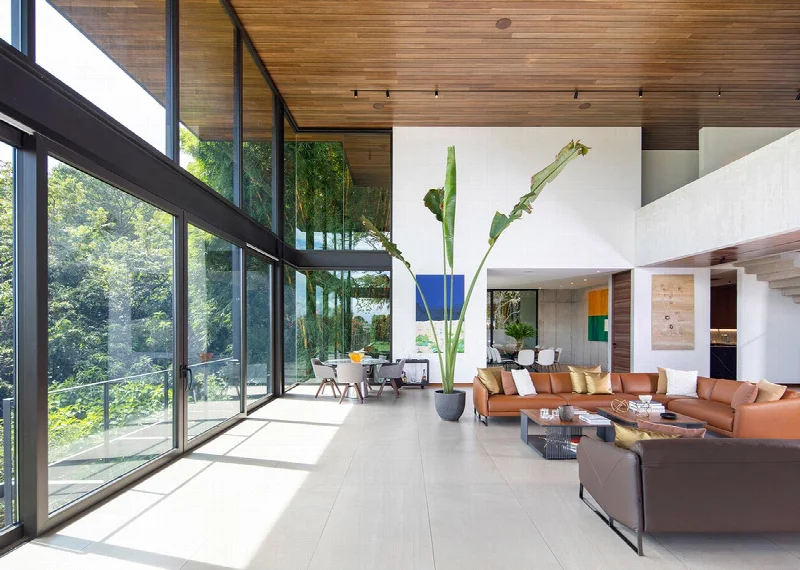 Главная особенность этого дома — огромный застекленный фасад. Тонкая стеклянная перегородка разделяет ландшафт и интерьер, но делает это особым образом. Она работает как осмотический фильтр: отражает буйную зелень коста-риканских холмов и одновременно позволяет природе проникать внутрь здания. В этом проявляется вечный поиск гармонии между человеком и природой — и одновременно их непреодолимые различия.