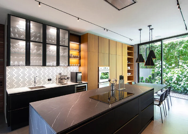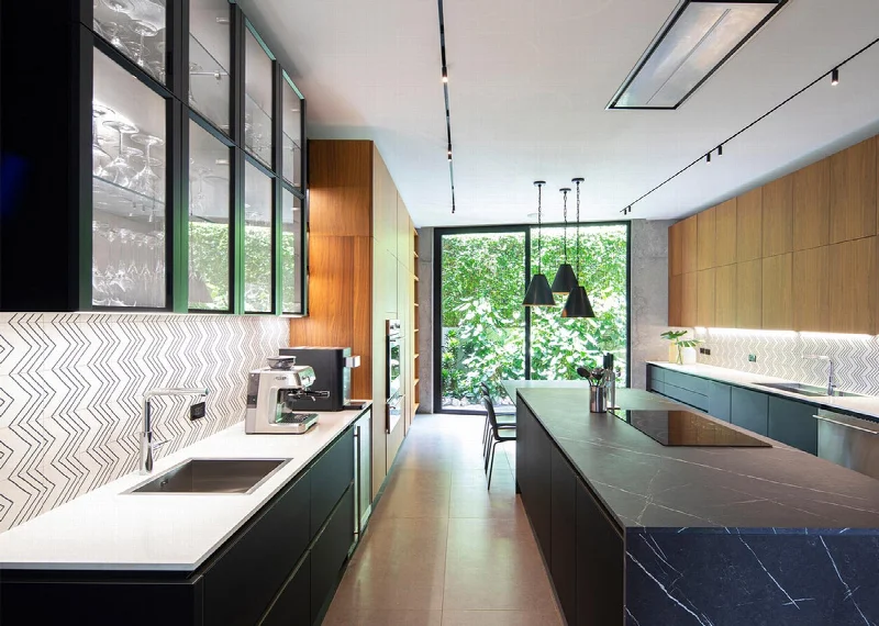 Это ощущение особенно сильно в жилой зоне. Центральное место в планировке занимает двухсветное открытое пространство с видом на холмистый ландшафт. Здесь расположены гостиная и столовая с паркетом и керамическими плитами Nordic Stone от Italgraniti в отделке Denmark, а также кухня, где дизайнеры выбрали напольный керамогранит из линии Materia D с отделкой Cenere (тоже Italgraniti). Кухонный остров облицован мрамором Nero Marquina, а фартуки выложены геометрической плиткой Tangle от Ornamenta.