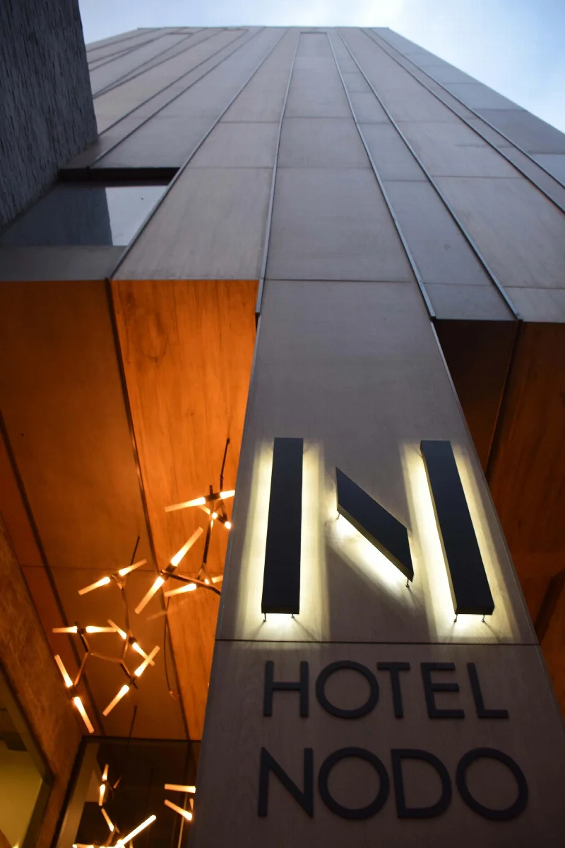 Фасады отеля Nodo облицованы 2400 квадратными метрами 3-миллиметровых панелей Laminam, обработанных по биоактивной технологии. Под воздействием солнечного света они ведут себя как живой организм и очищают воздух. Помимо антизагрязняющих свойств, поверхности обладают самоочищающимся эффектом. Дождевой воды достаточно, чтобы удалить любую остаточную грязь с фасада, что значительно сокращает потребность в чистке и обслуживании.