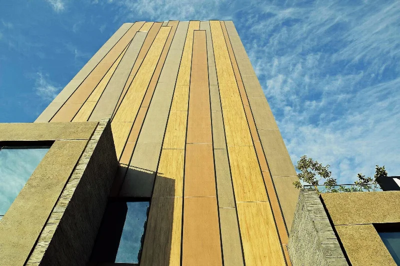Бетонное основание венчает фасад, ставший символом всего проекта. Он воплощает идею ландшафта и одновременно предлагает не просто устойчивое, а активное решение. «Мы искали поверхности, похожие на дерево, особенно на стволы деревьев в лесу, чтобы передать этот природный элемент. Но в то же время мы хотели, чтобы они способствовали снижению загрязнения, действуя как настоящая зеленая зона и очищая воздух подобно деревьям. Учитывая все это, мы поняли, что поверхности Laminam могут выполнять двойную роль: образа и функции».