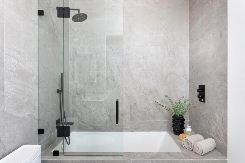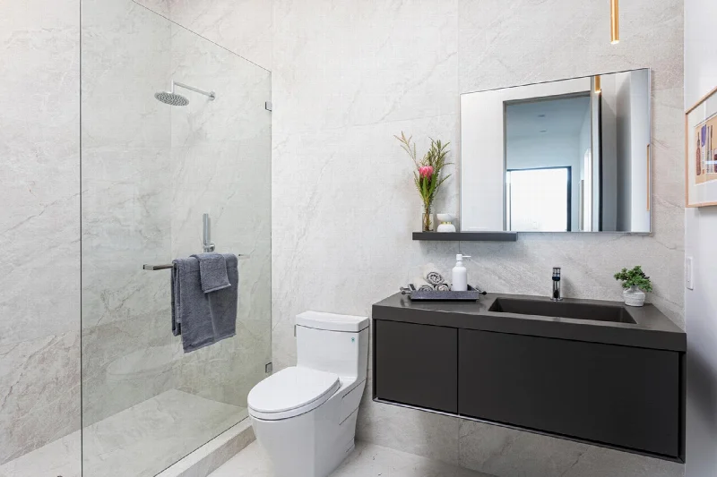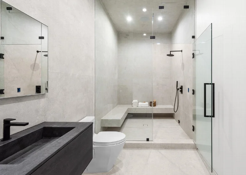Просторные ванные комнаты получили особое внимание. Здесь использована коллекция Epika от Supergres в цвете Shell, вдохновленная французским известняком. Стены отделаны плиткой Muse от Imola Ceramica в белых и серых тонах. Серые оттенки дополнены поверхностями Pearl из коллекции H24 от Supergres. Акцентные стены в ванных выполнены черной плиткой Tube от Imola Ceramica, а просторные душевые кабины облицованы текстурой Camargue из коллекции Stonconcrete того же производителя. Выразительные поверхности Form от Ceramica Sant'Agostino имитируют фактуру exposed concrete со следами опалубки, добавляя интерьерам брутальную графичность.