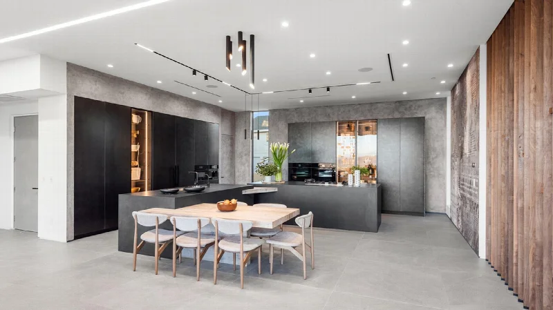 В общей сложности около 12 тысяч квадратных метров керамической плитки использовано для отделки интерьеров и фасада. Для мощения наружных патио выбрана коллекция Tune от Refin в цвете Rock. В жилых пространствах та же коллекция чередуется с темными акцентами Infinity в оттенках Concrete Black и Total Black.