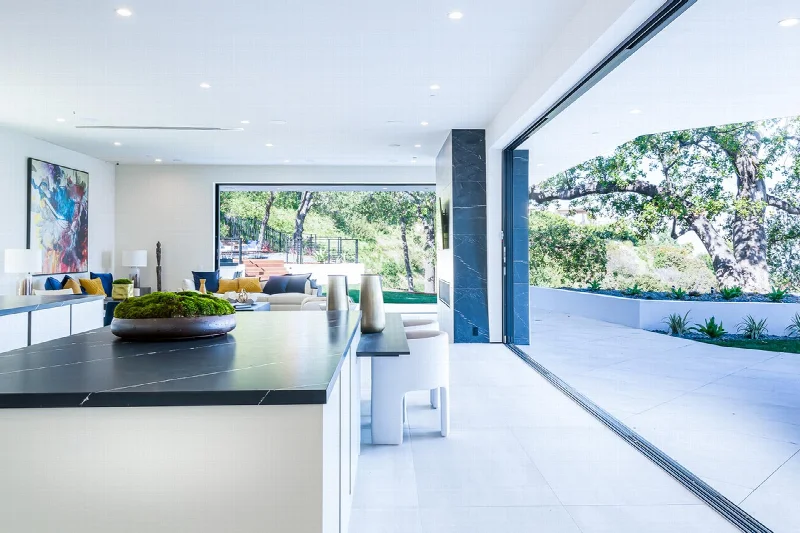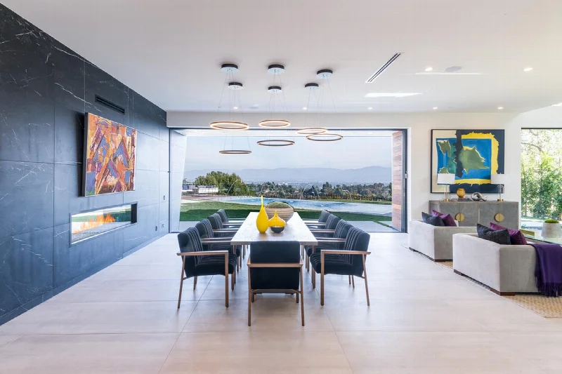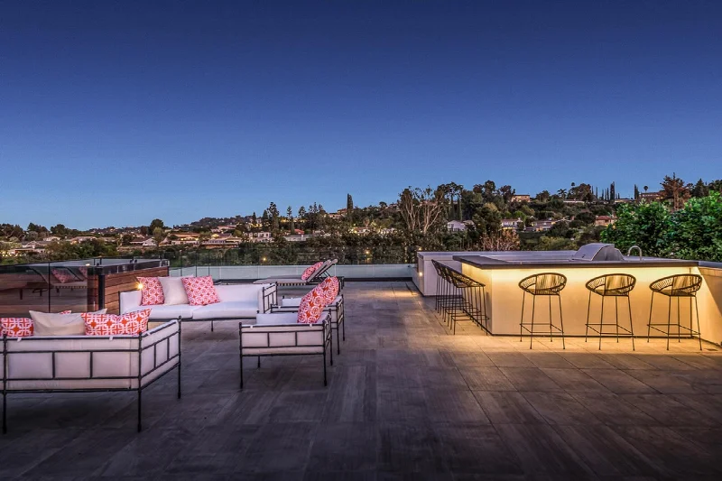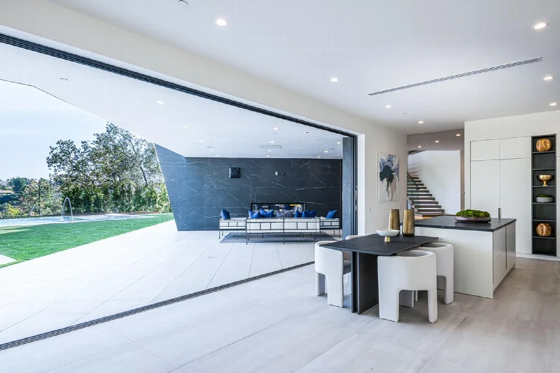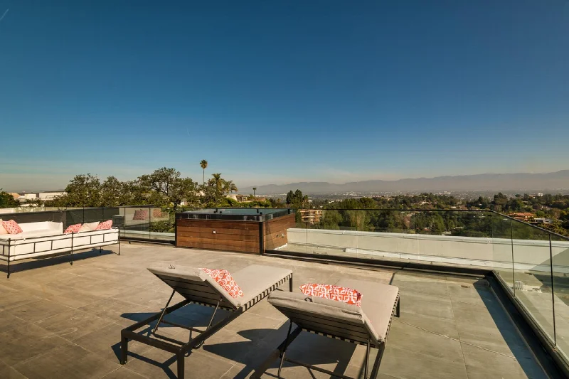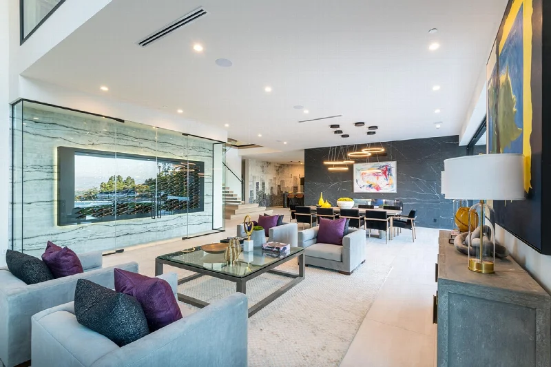 Главным достоинством виллы стала огромная терраса с уникальным панорамным видом на Лос-Анджелес. Современный стиль архитектуры выражен в линейности и чистоте интерьеров. Цвет используется как инструмент зонирования: он выделяет стены просторных помещений и акцентирует двухсветные пространства, выходящие наружу. Благодаря этому приему различные зоны и их функции легко считываются при взгляде на интерьер.