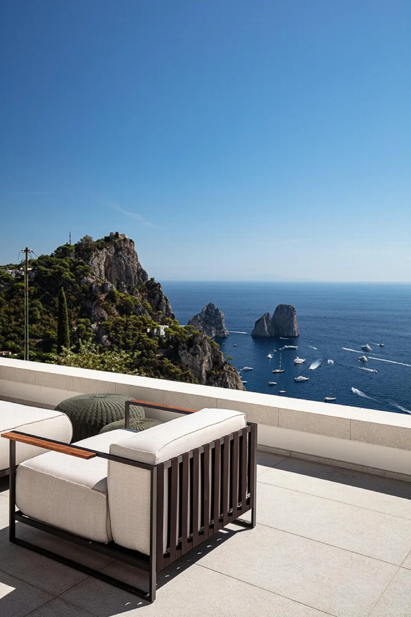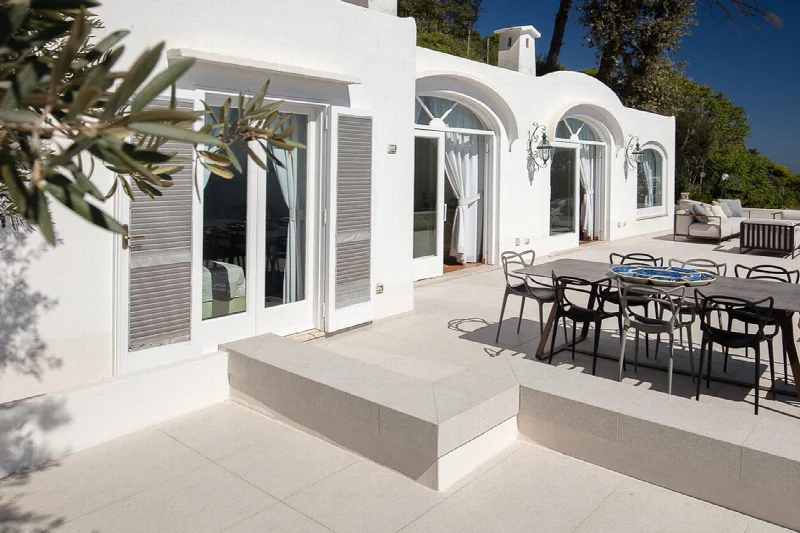 Главная гордость виллы — ее терраса. Именно на нее приходится 90 процентов очарования этого места, и именно вокруг нее строится вся жизнь дома. Отсюда открывается захватывающий панорамный вид на Марина-Пиккола, скалы Фаральони, мерцающую в дымке береговую линию и бескрайнее море. Днем терраса купается в красках и свете, запечатленных великим неаполитанским пейзажистом Джачинто Джиганте. На закате она приобретает романтическую драматичность, словно сошедшую с полотен символиста Карла Вильгельма Дифенбаха.