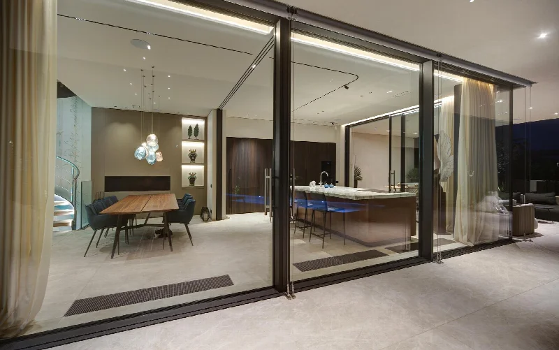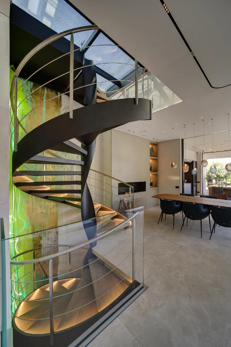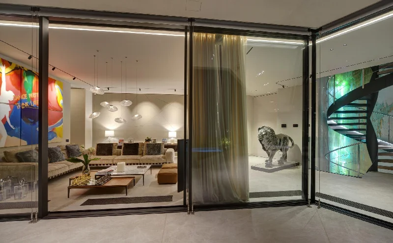 Интерьеры, разработанные дизайнером Кристиной Пулаевой в сотрудничестве с Elio Sereno Home, строятся на игре контрастов и геометрии. Здесь царит изысканная, но динамичная атмосфера, а главным приоритетом остается высокий уровень комфорта. Панорамные окна в полный рост обрамляют великолепный пейзаж, превращая его в естественное украшение интерьера. Освещение и цветовая гамма вдохновлены средиземноморской палитрой, характерной для региона озера Гарда. В отделке преобладают природные материалы: дерево и мрамор чередуются с металлом индустриального оттенка в мебели, лестнице и предметах искусства.