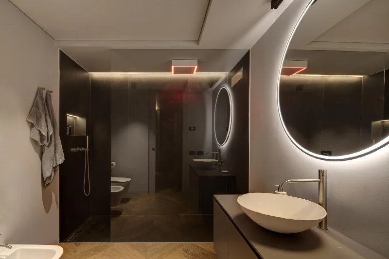 Особое внимание в проекте уделено экологической устойчивости. Здание и его инженерные системы используют передовые технологии для максимальной энергоэффективности в соответствии с критериями сертификации CasaClima. Внимание к техническим и эстетическим деталям отражается и в выборе крупноформатных плит Laminam для покрытия полов и стен. Для душевых и столешниц в ванных использованы панели из коллекции Ossido с динамичной поверхностью, в которой переливаются интенсивные оттенки меди и оксидов металлов. Для зоны бассейна и патио выбрана коллекция I Naturali в цветах Diamond Cream Bocciardato и Calacatta Michelangelo в формате 1×3 метра толщиной 5 мм. Благодаря устойчивости к износу, ударам, пятнам, царапинам и плесени, эти панели идеально подходят для использования в сложных условиях, таких как бассейны и солярии.