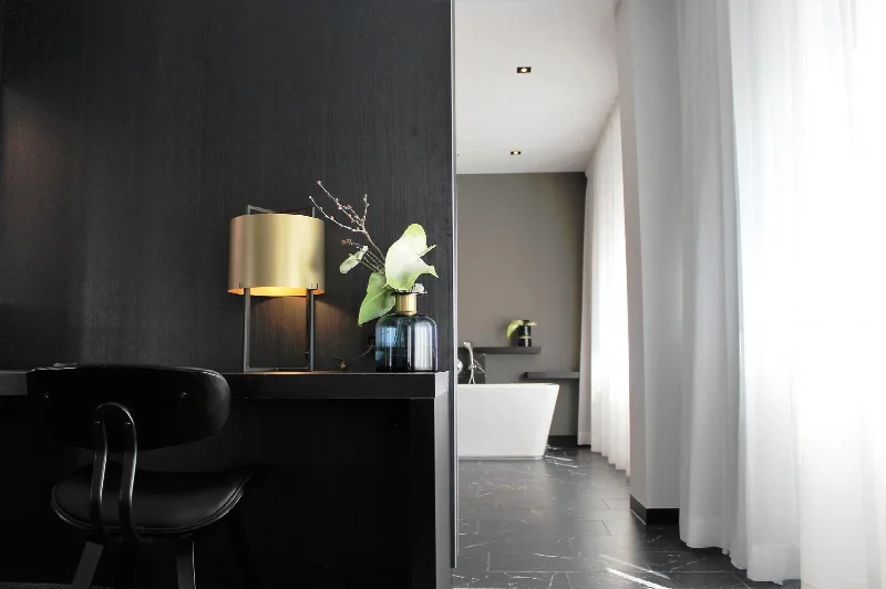 Люксы оформлены как расслабляющие и камерные пространства, «персонализированные с использованием теплых и роскошных материалов: поверхностей с эффектом мрамора, изысканных тканей, оттенков черного, зеленого и золотого». Более 1800 квадратных метров поверхностей в вестибюле, холле и ванных комнатах облицованы плиткой из коллекции Marmi Reali от Ceramiche Piemme в полированных вариантах Nero Reale и Carrara. Геометрический черно-светлый узор создает трехмерный оптический эффект, а плитка с мраморным рисунком придает интерьерам атмосферу роскоши.