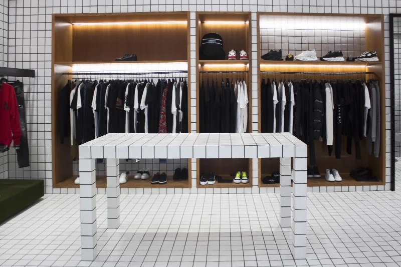 В двух бутиках Blessing, спроектированных неаполитанским архитектором Кармине Абате, керамическая плитка становится главным героем интерьера. Это сознательная отсылка к культовому коллективу Superstudio, который в 1960–70-х годах переосмысливал архитектуру через радикальную простоту и геометрию. Пол, стены и потолок здесь облицованы непрерывной светлой шахматной клеткой. Она выравнивает любые неровности, ниши и проемы, превращаясь в ключевой элемент идентичности бренда.