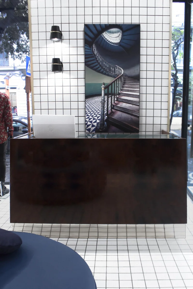 Тысячи квадратных белых керамических плиток (в неаполитанском магазине площадью 50 квадратных метров их 12 тысяч, в 100-метровом бутике в Кастелламмаре — 20 тысяч) заливают пространство светом и визуально расширяют тесные помещения. Плитка Ceramica Vogue из коллекции Interni цвета ice white (в Неаполе) и light blue (в Кастелламмаре) уложена в формате 10×10 см с темными швами шириной 5 мм. За кажущейся простотой стоит кропотливая работа: естественные неровности кладки исправлены с помощью ровных гипсокартонных панелей, которые послужили основой для идеально линейных, однородных поверхностей.
