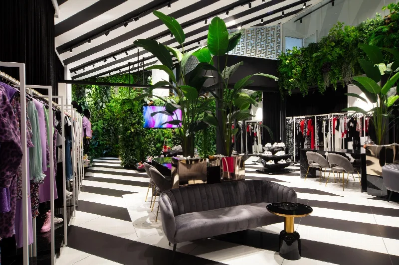 Декор дополняют обилие растений и гламурная мебель: мраморные столы, черно-золотые аксессуары, диваны и кресла в стиле 70-х, а также люстра, которая с иронией отсылает к салонам Версаля.