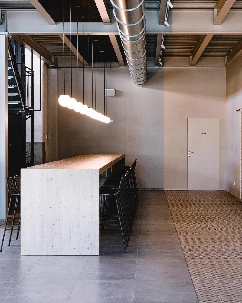 Просторные внутренние помещения с высокими потолками были реорганизованы без утраты их характерных черт. Внутренние уровни удвоили за счет новой антресоли, опирающейся на открытую металлическую конструкцию. Доступ к ней организован по большой двухмаршевой лестнице. Кухня и пивоваренное производство расположены на первом этаже. Оба процесса видны за длинной стойкой, которая проходит по диагонали, создавая более динамичную планировку. Зоны для посетителей занимают оба уровня. На первом этаже организована дегустационная зона с удобными диванами и креслами. На антресоли разместился ресторан с примыкающей неформальной лаунж-зоной.