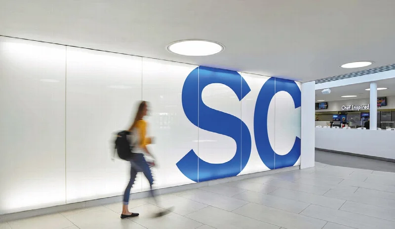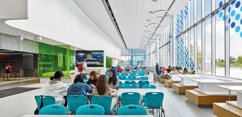 Главная цель проекта заключалась в том, чтобы немедленно открыть здание для естественного света и внешних видов, создав приятные дружелюбные места, где студенты могут учиться, сотрудничать и общаться. Интерьер сочетается с тщательно продуманной системой навигации — своеобразными крупными графическими мотивами, которые одновременно служат декоративными элементами. Цветные стены и синие гороховые узоры, появляющиеся также на окнах фасада главного здания, стали фирменным знаком Gow Hastings Architects, ранее спроектировавших другие образовательные здания в Канаде, отличающиеся хорошо выверенными пространствами с использованием света и цвета. Система крупных LED-светильников также призвана идентифицировать транзитные зоны, центральные коллаборативные пространства и зону кафетерия, все из которых выходят на обширную территорию.