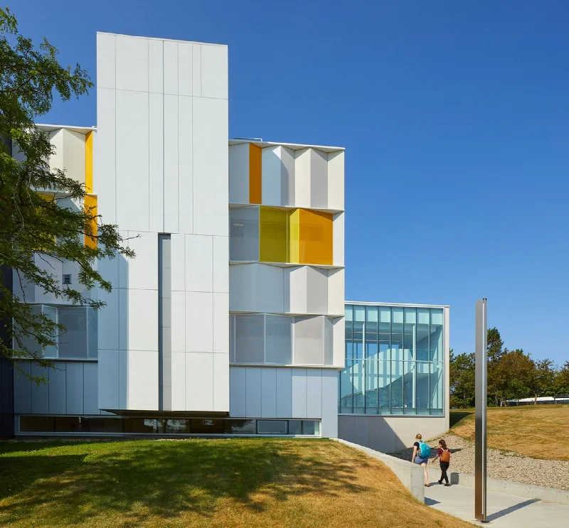 Бюро Gow Hastings Architects, получившее проект, начало с того, что сняло с каркаса темно-коричневую алюминиевую оболочку здания и облицевало его алюминиевыми панелями alpolic. Колледж тесно сотрудничал с командой дизайнеров при выборе цвета панелей, которые преображают фасад, одновременно интегрируя его с оригинальными коричневыми зданиями кампуса и новым соседом, облицованным кортеновской сталью. Располагая панели схожих цветов под разными углами, архитекторы смогли улавливать естественный свет в различных условиях, создавая иллюзию более глубокой цветовой палитры.
