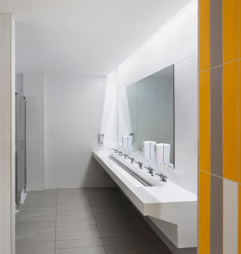 Внутренние цвета отражают внешние: светлый оштукатуренных стен, ярко-желтый окон и цветовые композиции крупноформатной керамической плитки, использованной как на полу, так и на стенах. Проект, получивший множество наград, включая премию Ceramics of Italy Tile Competition 2021 в категории институциональных зданий, выбрал для полов коллекцию Discover с эффектом камня от Panaria Ceramica в чередовании White и Origin grey. Коллекция I Colori от CE.SI Ceramica была использована для создания цветных вертикальных перегородок путем смешивания White с Vanadio (насыщенный желтый), Perla (серый), Torba (темно-серый) и Quarzo (светло-серый). Та же плитка использована в ванных комнатах: Origin на полах и I Colori на стенах, где ослепительный Bianco с вкраплениями цветных композиций перекликается с красочной геометрией общественных зон.