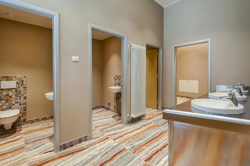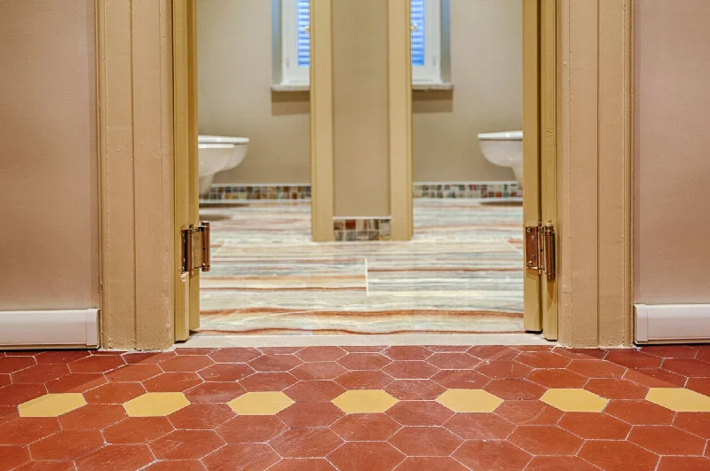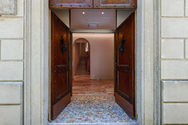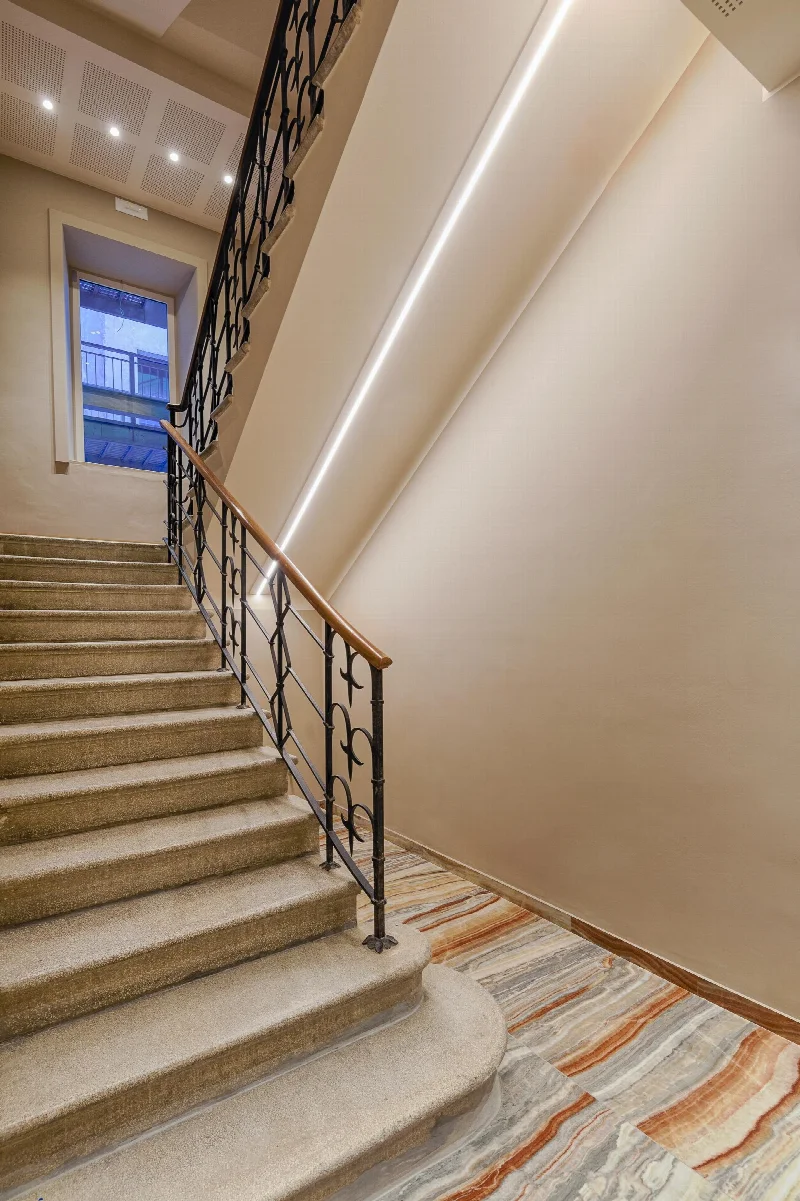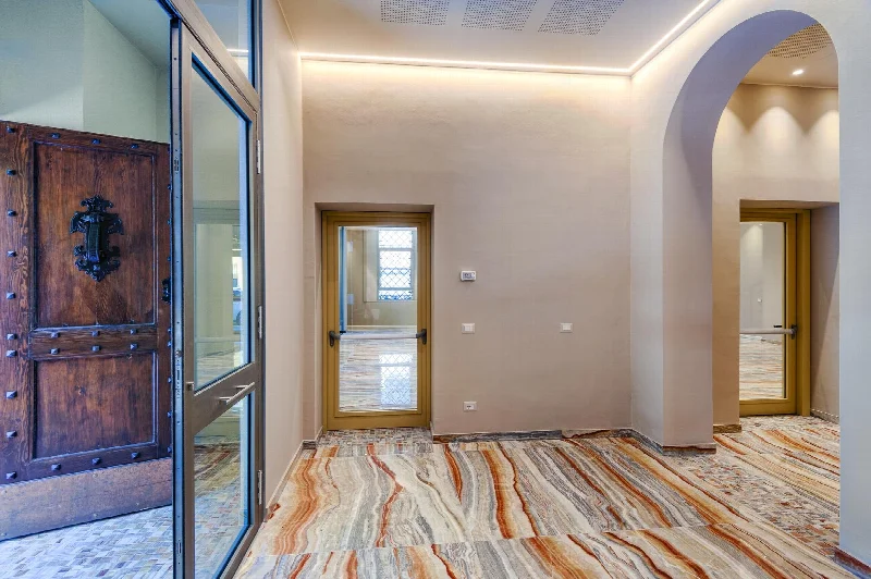Оригинальные украшения и отделка 1930-х годов были сохранены везде, где это было возможно. Существующая красная и желтая шестиугольная напольная плитка была сохранена на всем первом этаже с монументальной лестницей из терраццо. Те же цветовые схемы были использованы на разных этажах здания, чтобы гармонизировать новое со старым. После обширных исследований выбор пал на керамическую плитку для пола и стен с глянцевым мраморным эффектом из коллекции Boutique Onice Fantastico, производимой участником группы Del Conca — компанией Ceramica del Conca — совместно с материнской компанией Ceramica Faetano, базирующейся в Сан-Марино. Эти поверхности вдохновлены мексиканским ониксом, который называют то «фантастическим красным», то «адским красным» из-за его красноватого фона, пересеченного поперечными прожилками разнообразных оттенков — от кремового до орехового, коричневого и сине-зеленого.