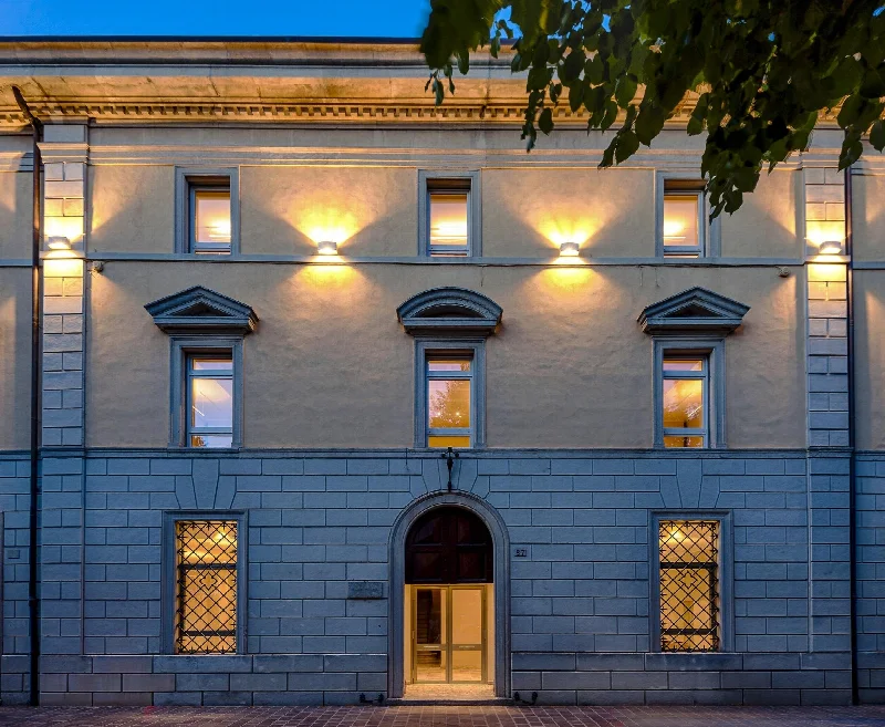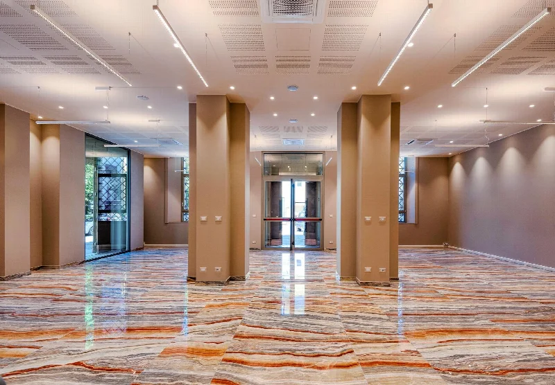Реставрация исторического здания 1930 года превратила его в современный университетский центр с глянцевым мраморным керамогранитом Boutique Onice Fantastico от Ceramica del Conca и Ceramica Faetano.
