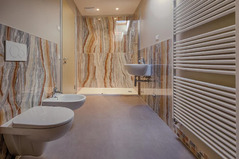Этот мраморный эффект с его богатыми цветами и привлекательными прожилками был выбран «не в матовой версии, которая могла бы выглядеть чрезмерно пластиковой, а в глянцевой версии с ее выдающейся отражающей способностью и глубиной цвета», — объясняет архитектор. Механическая прочность, долговечность и легкость чистки и ухода стали ключевыми факторами, побудившими Марчеллу Микелотти выбрать этот материал, чей эстетический эффект получил высокую оценку. Крупные плиты 60×120 см и 120×120 см были уложены на полы и стены, а версия в виде мозаики 30×30 см использована на различных участках стен, на некоторых порогах, в качестве плинтусов и в качестве керамического ковра на входе между исторической деревянной дверью и стеклянным окном. Эта калейдоскопическая игра цветов, прожилок, контрастов и узоров прекрасно сочетается с вкусами и атмосферой двадцатого века, создавая конвергенцию стилей и эпох, которая непременно понравится молодому поколению.