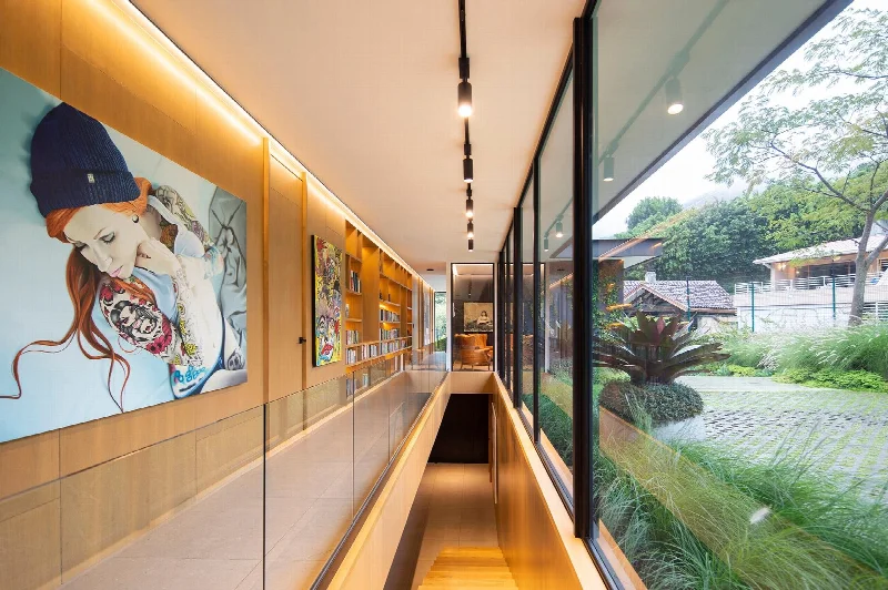 С улицы двухэтажное здание площадью 400 квадратных метров, спроектированное местной фирмой Parq Architecture, выглядит как единый монолит из литого бетона серо-белого цвета со следами опалубки и стекла с металлической конструкцией на фасаде, обращенном в сторону холма. «Сталь и бетон типичны для строительства в Центральной Америке. Поскольку мы занимались только интерьером, мы связали эти материалы с более мягкими цветами, вызывающими сопереживание, и отдали предпочтение приглушенным тонам в отделке», — добавляет Грег. «Натуральность и экологичность дерева и керамики мы противопоставили твердости бетона, стерли любую границу "внутри-снаружи" и создали расслабляющие и свободные пространства в диалоге с пышным бамбуковым садом».